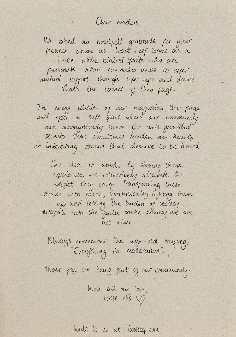 The last page of each Loose Leef edition is a special space for our community to anonymously share stories or secrets.